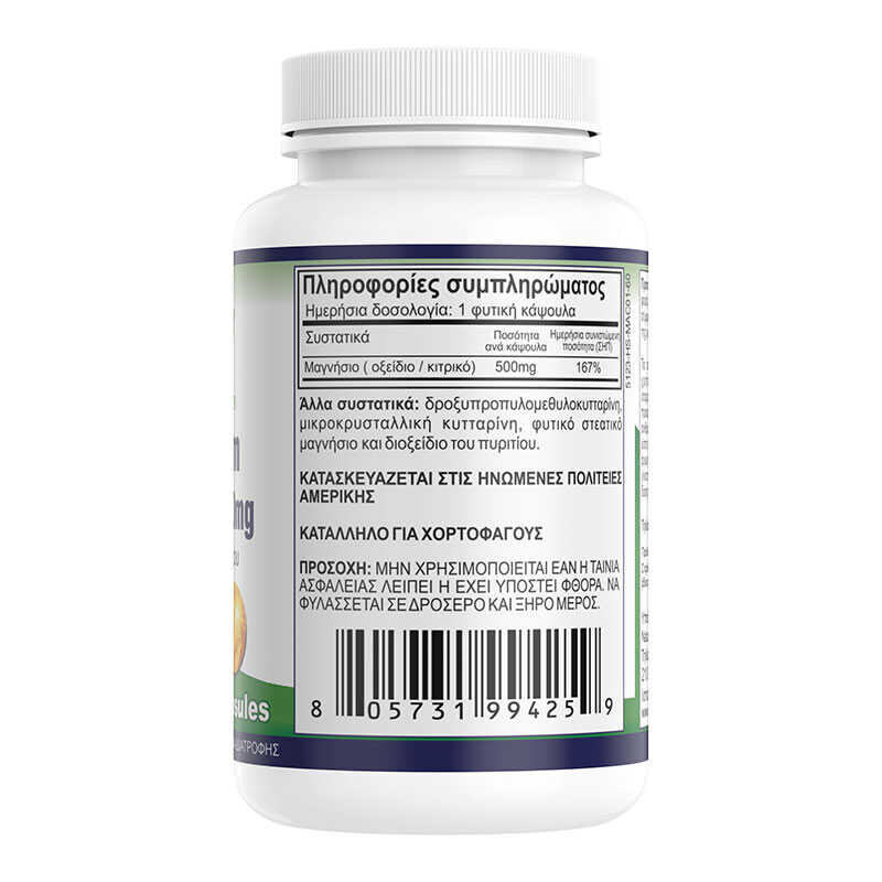 Συσκευασία: 60 φυτικές κάψουλες Μαγνήσιο 500mg μέγιστης απορρόφησης.